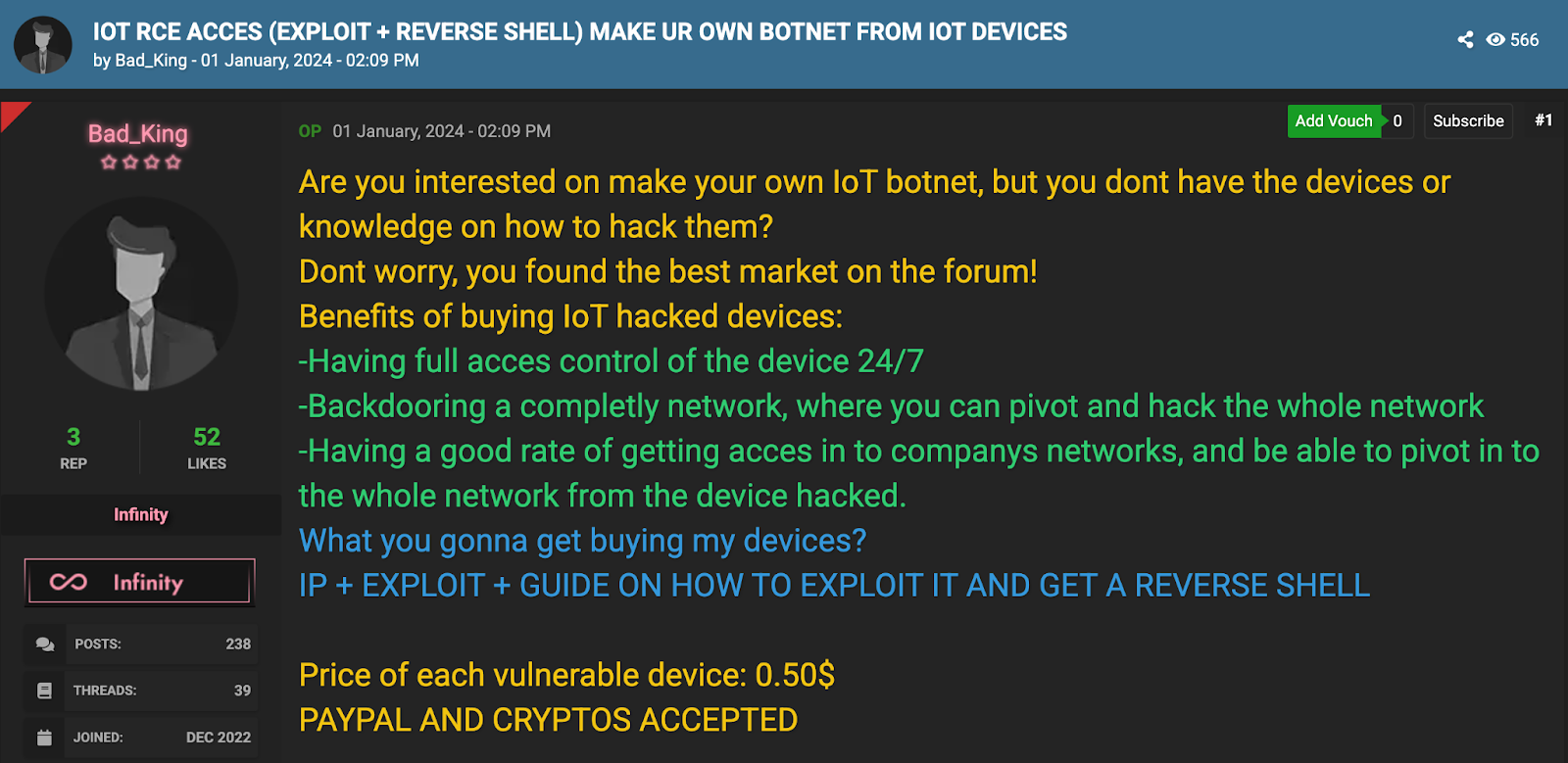 On the flip side of these defensive efforts, threat actors are busily weaponizing vulnerable IoT devices. In cybercrime communities, IoT exploits and access are bought and sold like commodities. The screenshot below shows an example of a forum advertisement where a seller is offering pre-hacked IoT devices for $0.50 apiece.